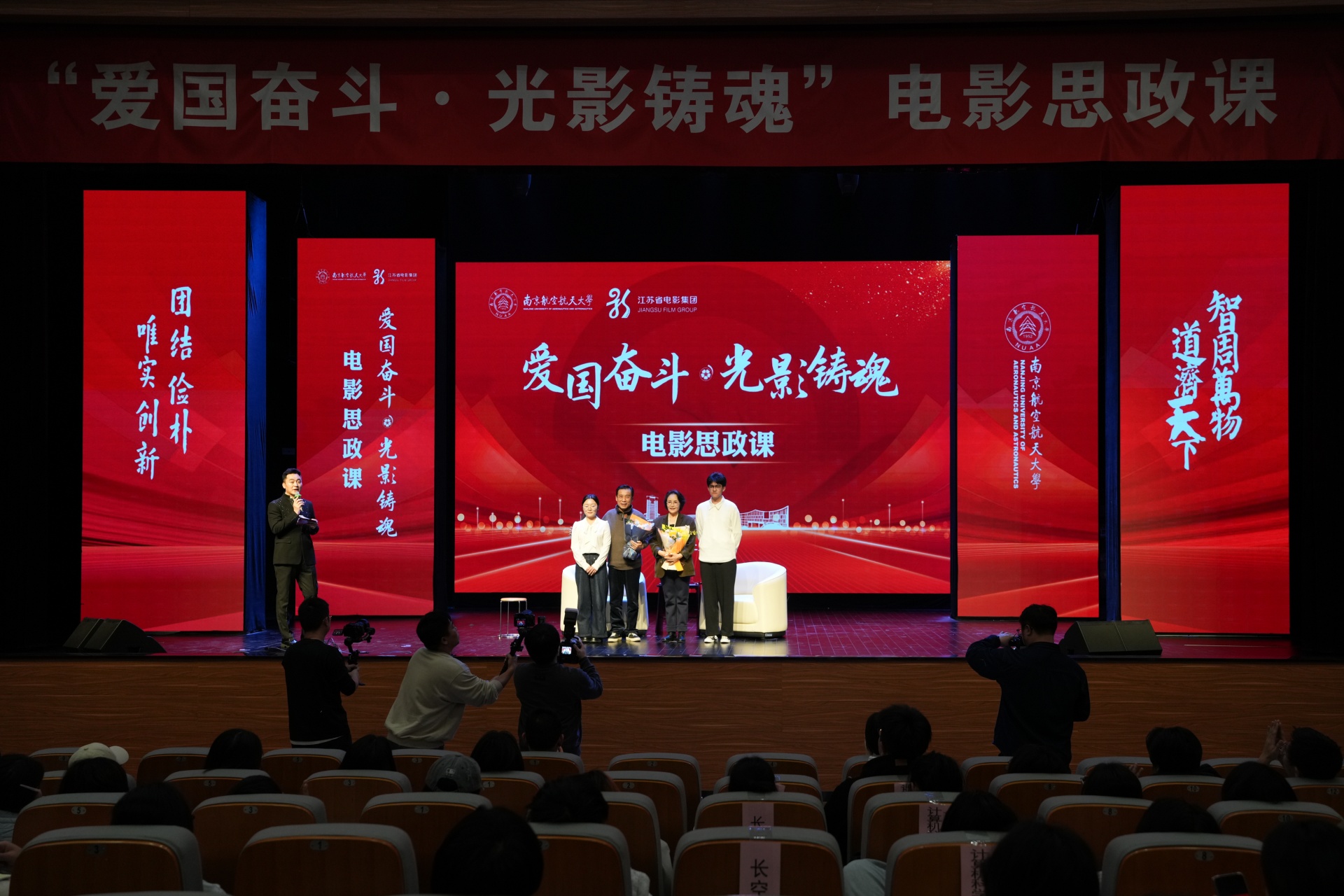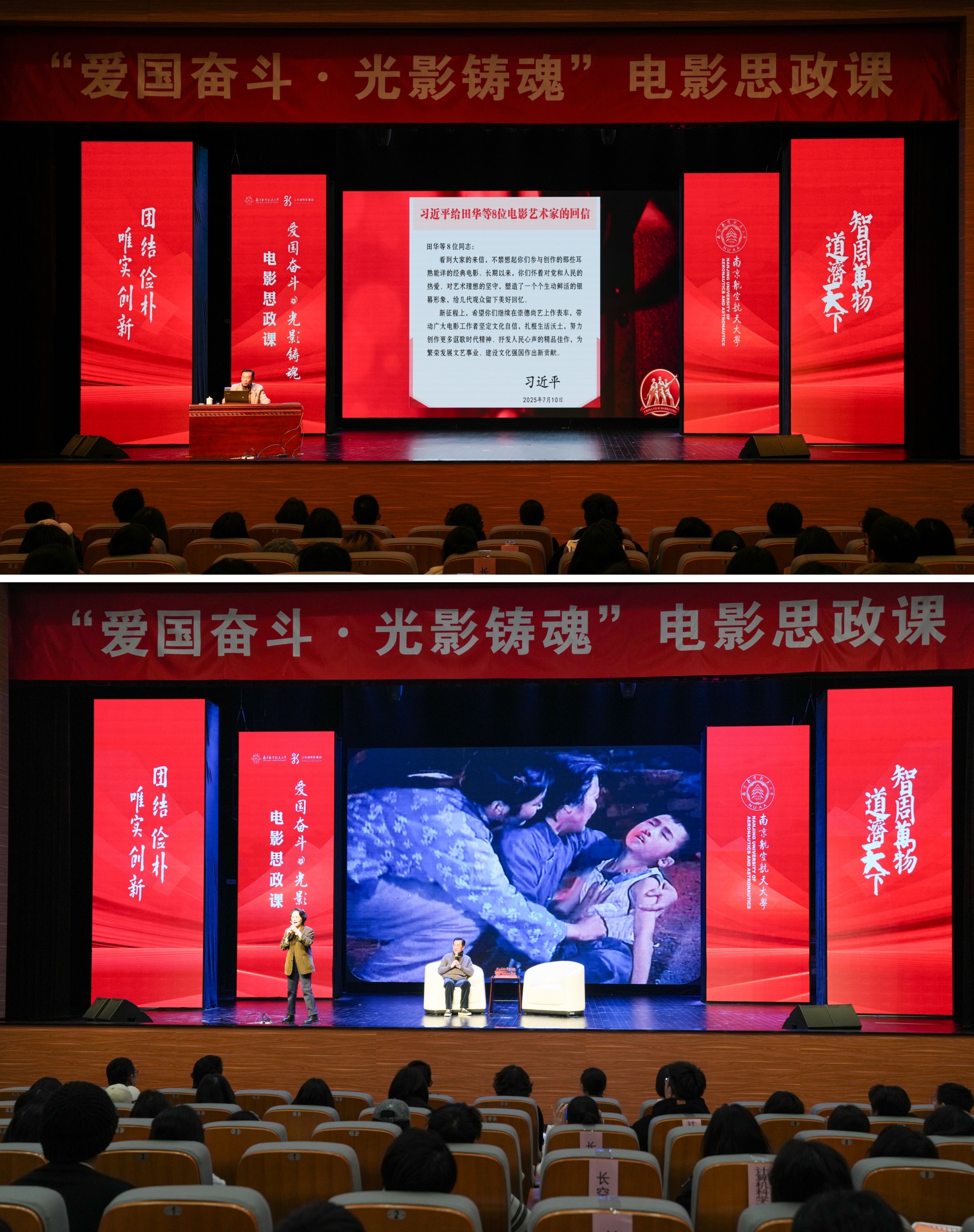 诞生于抗美援朝烽火之中的南航,拥有与生俱来的红色基因。其校园文化中深深镌刻着“航空报国”的红色基因与“智周万物,道济天下”的使命情怀。在本次电影思政课中,我院学生代表怀着极大的热情与期待,与南航学子一同沉浸于这场特别的“大师课堂”中。