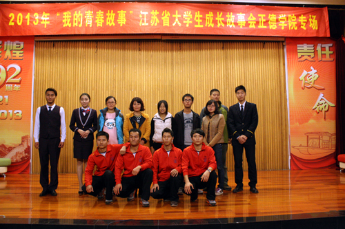 11月13日下午,由共青团江苏省委主办、片区高校承办的2013“我的青春故事”江苏省大学生成长故事会正德专场在我院报告厅隆重举行。来自我院民用航空系“飞行之星”吴晓晨、“职业规划之星”工商管理系王高灵、江苏海事职业技术学院的“职业技能之星”团队、南京视觉艺术职业技术学院的“支教之星”海雯、南京机电职业技术学院的“行动之星”刘桐倾情讲述了他们的成长经历和感悟,受到在场300余名师生的热烈欢迎。