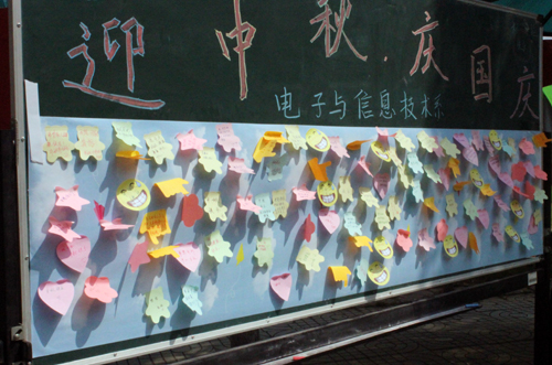 时至中秋,月正圆。今年是2015年新生第一次离开亲人在大学里过节。9月27日上午10点,正德学院电子与信息技术系团总支学生会举办以“花好人更好,月圆人团圆,心有千千结,自有相知人”为主题的活动,不少新生参与活动表达对家人的思念和祝福。