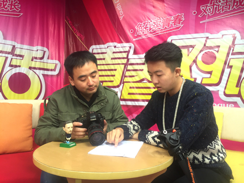 涂俊豪(右)与指导教师王子煊老师沟通拍摄方案(资料图片)