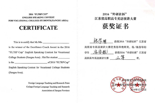 12月3日,历时两天的2016年“外研社杯”江苏省高职高专英语演讲大赛在江苏城市职业学院落下帷幕。我院民用航空系空中乘务专业冯安航同学荣获三等奖,基础部张学明老师荣获优秀指导教师奖。