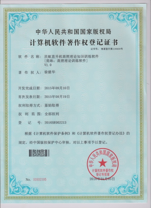 该项课题于2015年6月被教育部职业院校信息化教学指导委员会批准正式立项,研究周期为一年。在这一年里,徐建华老师带领课题组成员刻苦钻研,攻坚克难,解决了一个个技术难题,研究使用最新的移动互联网技术开发了民航直升机理论学习平台。该平台成功实现了飞行学员通过手机就能随时随地进行直升机理论知识训练,并且根据学员训练情况自动颁发相应等级的“飞行勋章”,提高了学员学习趣味性和方便性,2016年1月被国家版权局正式授予计算机软件著作权(软著登字第1180830号)。