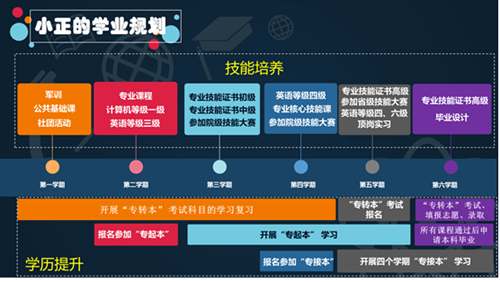 其次分别从技能和升学两条发展路径,以每个学年每个学期为单位进行学年学期学业规划详解。通过结合历届优秀学子就业和升学的成功案例,向同学们介绍了我院各专业对应技能证书、省院级学生技能赛项、校企合作企业项目、人才培养模式、专转本、专接本和专起本等方面相关事项。