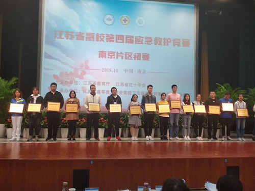 为深入实施健康江苏战略,培养大学生健康观念和健康生活方式,提高健康素养,10月19日—20日,江苏省高校第四届应急救护技能竞赛在河海大学江宁校区举行。本次比赛由江苏省教育厅、江苏省红十字会联合主办,高校卫生保健研究会南京协作区承办,共汇集了南京片区31所高校参赛代表队,其中不乏专业的医疗救护团队,我校四名参赛队员在学生处傅蕴男老师和机电系李浩文老师两位的指导下经过紧张的赛前集训,认真训练,发扬不怕吃苦的精神,以娴熟的技术技能以及在比赛中稳定的发挥最终荣获团体二等奖。