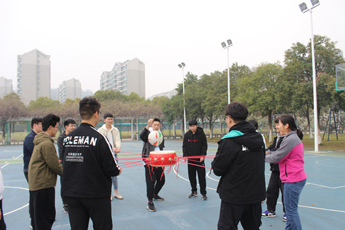 首先进行的游戏项目是“击鼓颠球”,20根绳子分别由10位师生攥着,紧紧地将大家串联在一起,大家为了共同的目的向同一个方向奔跑。球击打在鼓面上敲出的声响,也召唤着大家齐心协力地呐喊!随后,“传球入杯”项目开始了。游戏对队友间的默契程度要求非常高,稍有失误球便会不慎落地。活动中,师生们紧密配合、相互鼓励、为同一个目标共同努力,相互支持的团队精神在小小游戏中得以体现。