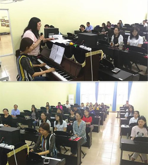学习活动的第二阶段,刘翔老师带领大家就教师职业健康中的“声带小结”问题提出了有效对策,并和孟馨老师一起,为大家作科学发声方法辅导训练,同时教唱歌曲《我和我的祖国》。