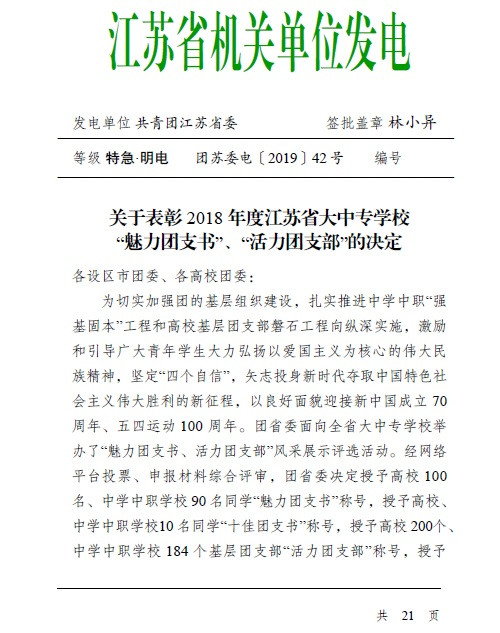 近日,共青团江苏省委下发《关于表彰2018年度江苏省大中专学校“魅力团支书”、“活力团支部”的决定》(团苏委电〔2019〕42号),我院1名同学获评“魅力团支书”,1个团支部获评“活力团支部”。