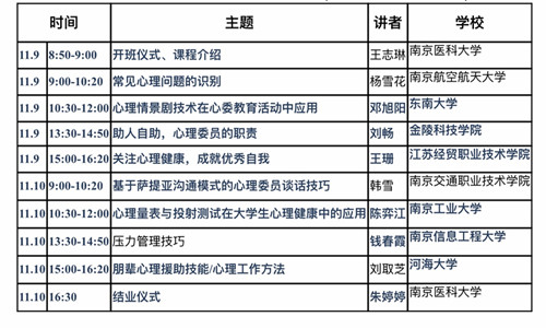 培训班在南京医科大学王志琳老师主持的开班仪式中拉开序幕。紧接着由南京航空航天大学杨雪花教授为同学们详细介绍了一些常见心理疾病的症状和简单的应对措施;东南大学邓旭阳老师通过现场表演心理情景剧的方式,使同学们更清楚地认识到如何在日常生活中释放负面情绪;金陵科技学院刘畅老师和江苏经贸职业技术学院王珊老师从班级心理委员如何帮助他人和成就自我两方面展开了详细的讨论;南京交通职业技术学院韩雪老师以现场演练的方式为大家详细阐述了基于萨提亚沟通模式的心理委员谈话技巧;南京工业大学陈弈江老师结合心理量表与投射测试在大学生心理健康中的应用给同学们分析了西方心理量表在中国应用中的一些不可行性;南京信息工程大学钱春霞老师为同学们带来了一场解压盛宴,让同学们明白了如何科学地释放自己的压力;最后,河海大学刘取芝老师围绕“朋辈心理援助技能和心理工作方法”为同学们做了重点介绍,同学们深刻掌握了在帮助身边同学解决心理问题时所需要的系列技巧,增加了心理委员们的“实战”应对能力。