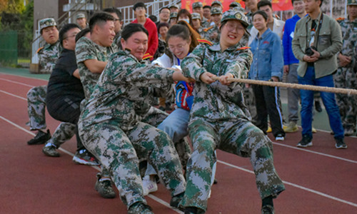 各系代表队云集运动场,按照比赛规则,每支参赛队伍需要有一名辅导员和两名女生参与,这更增加了同学们的热情。比赛哨声响起瞬间,队员们双手紧握长绳,憋足了劲拼命往后拉,似乎要用尽身上所有的力气,辅导员和教官也在队伍旁边助阵加油,围观新生的掌声、呐喊声此起披伏。