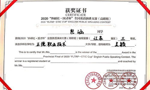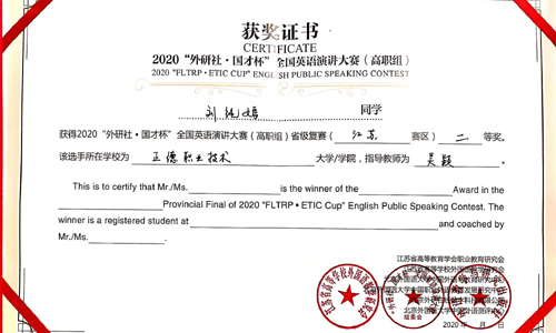 11月12日至14日,2020全国英语演讲大赛高职组(江苏赛区)比赛在江苏城市职业技术学院举行,我院刘纯嫣和包涵同学分获二、三等奖。