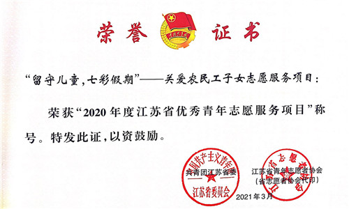 为了在新起点上不断开创强富美高新江苏建设局面,推动全省青年志愿服务事业广泛深入发展,共青团江苏省委、江苏省青年志愿者协会联合发文《关于公布2020年度全省青年志愿者行动评选结果的通知》团苏委联【2021】9号,我院“留守儿童,七彩假期”—关爱农民工子女志愿服务项目荣获“2020年江苏省优秀青年志愿服务项目”称号。