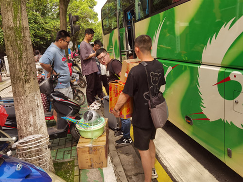 学生相互帮助搬运行李