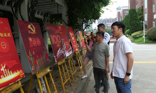 班主任徐嘉嘉带领学生在紫藤廊附近参与建党100周年海报设计展的布置,通过师生共同布展,把准育人时机,融合思政教育模式,对学生进行思想政治教育,培养学生的爱党、爱国情怀,以实现育人主题、内容和形式的有机统一。
