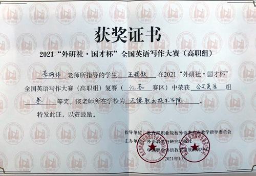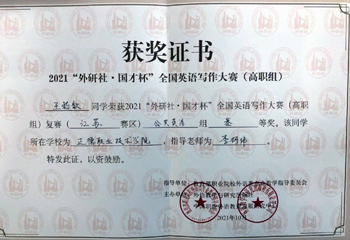 近日,“外研社·国才杯”全国英语写作大赛(高职组)江苏赛区公共英语组复赛结果公布,我院基础教育系大学英语课程组李柯伟老师,指导王嵇歆同学获得三等奖。