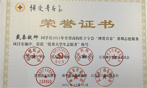 近日,江苏省红十字会、江苏省教育厅、共青团江苏省委等单位联合印发《关于2021年全省高校红十字会“博爱青春”暑期志愿服务项目实施情况的通报》。经过前期激烈的网络评审、现场项目汇报环节,我院红十字会“留下温暖、守护成长”项目荣获“江苏省高校红十字会‘博爱青春’暑期志愿服务优秀项目项目”,艺术设计与建筑工程系团总支书记崔杰获评优秀指导教师,院红十字会会员戴秦敏娜获评优秀大学生志愿者。项目同时荣获南京高校红十字会“博爱青春”暑期志愿服务活动二等奖。