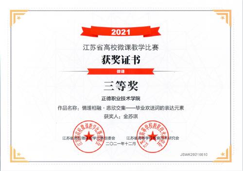 12月,江苏省高校微课教学比赛获奖名单公布,我部语数组金苏琪老师的微课作品《情理交融•悲欣交集——毕业欢送词的表达元素》荣获三等奖。