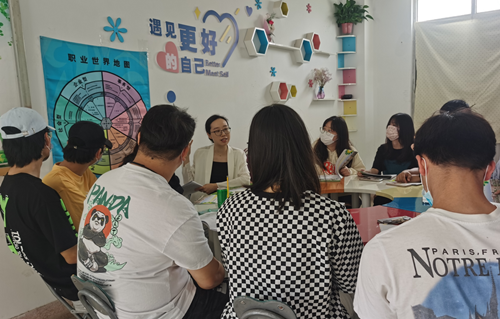 活动伊始,傅老师首先建立了团体规范,为团体成员创设了一个“民主、自由、开放、包容”的氛围,同时对团体的参与规则和保密原则进行了简要说明。接着,傅老师设计了三个与自我探索相关的活动,分别是:“兴趣岛沙龙”、“职业世界地图”以及“榜样的力量”。通过“兴趣岛沙龙”活动,傅老师带领团体成员探索自己的兴趣,让他们明白兴趣是个体从事职业最强的驱动力。在“职业世界地图”活动中,傅老师通过“霍兰德六边形”职业分类的讲解,让团体成员明白了职业领域与我们每个人的特质领域是可以联结的,而这种链接可以更好地帮助自己了解适合的职业。“榜样的力量”活动,是让团体成员回忆年幼时期的榜样人物,这有助于将学生心中理想的、倾慕的形象建构出来,通过榜样的特征描述,让成员们在迷茫中看到自己未来发展的方向。
