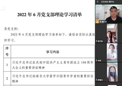 首先支部书记虞骏卿同志带领大家学习《习近平总书记在庆祝中国共产主义青年团成立100周年大会上的讲话》的重要精神。虞骏卿强调学习贯彻习近平总书记的重要讲话,要坚守理想信念、补足精神之钙,当前最重要的是,要坚定爬坡过坎的勇气、底气和信心;要投身改革攻坚、主动担当作为,用青春和汗水,不断奏响新时代的前进主旋律;要把学习当作信仰,不断提升能力和才干,切实担负起中国特色社会主义接班人的重任。“沧海横流,方显出英雄本色”。新时代是青年人实现价值、超越自我的时代,新时代是青年人建功立业、开创未来的时代。广大青年朋友要以习近平新时代中国特色社会主义思想为指引,坚定理想、主动担当、增长才干,以自强不息的精神、朝气蓬勃的姿态,奋力谱写中华民族伟大复兴进程中激昂的青春乐章。