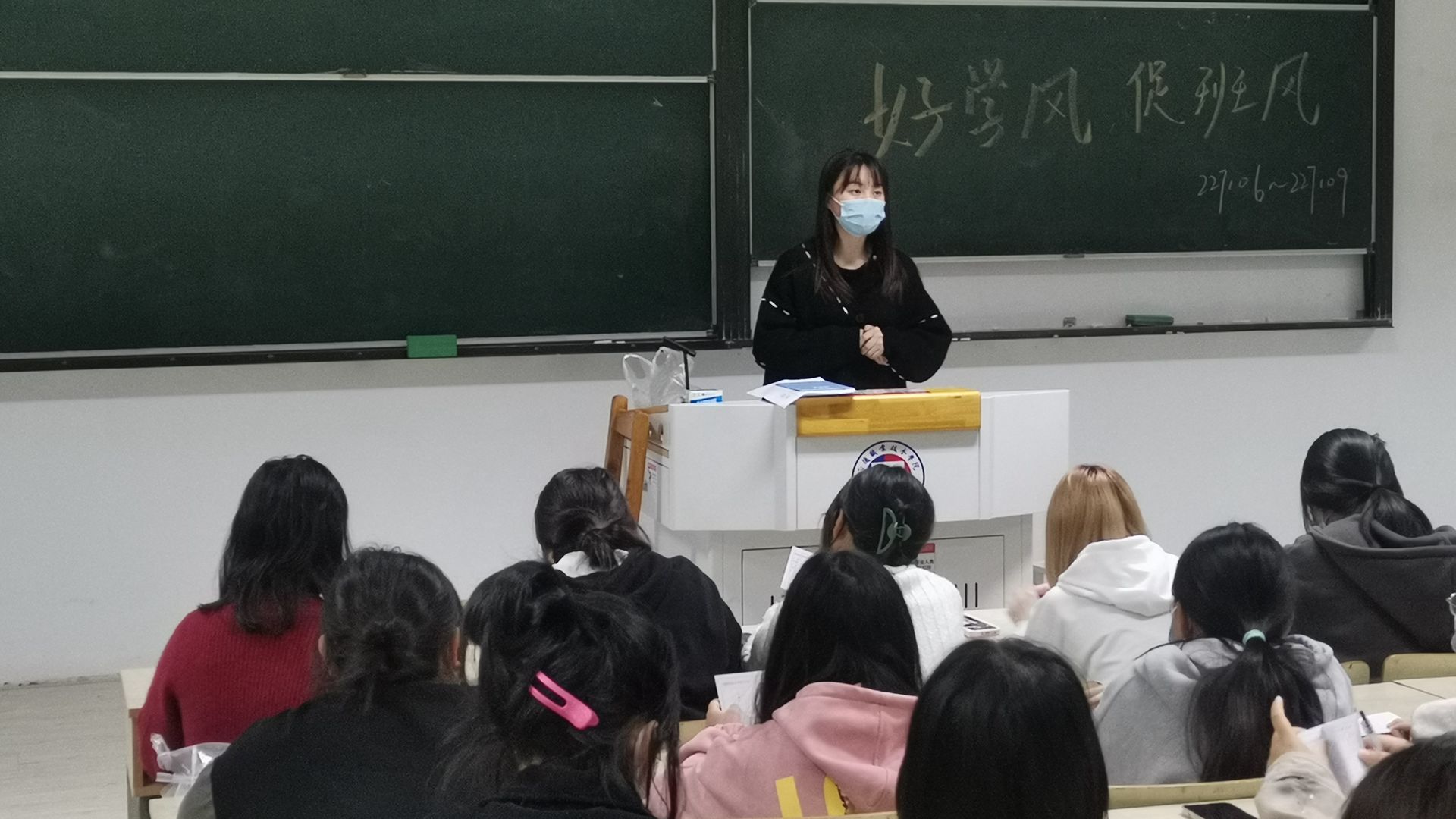 好班风,促学风。班级建设是学风建设的重要抓手,而学风是读书之风,治学之风,更是做人之风,良好的班风学风可以增强集体荣誉感和班级凝聚力。对学生也起着积极引领作用。通过定期召开主题班会和班委会,认真学习《学生手册》,制定班规并进行集中学习,不断增强学生规矩和纪律意识。遵守规章制度,是形成良好的班风、学风的基础。没有规矩,无以成方圆,班规是对思想品质、个人素质最基本的要求。正因为同学们能够自觉遵守,同学们才有了文明礼貌的言谈举止、求实创新的学习风气、活跃热情的课堂气氛、安静有序的自习纪律。